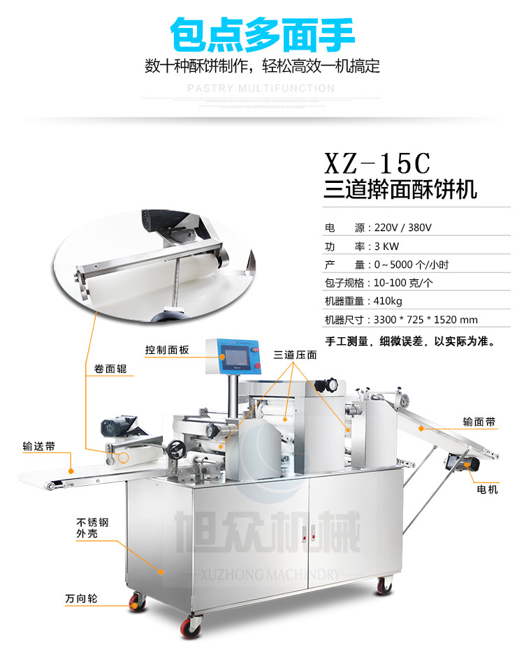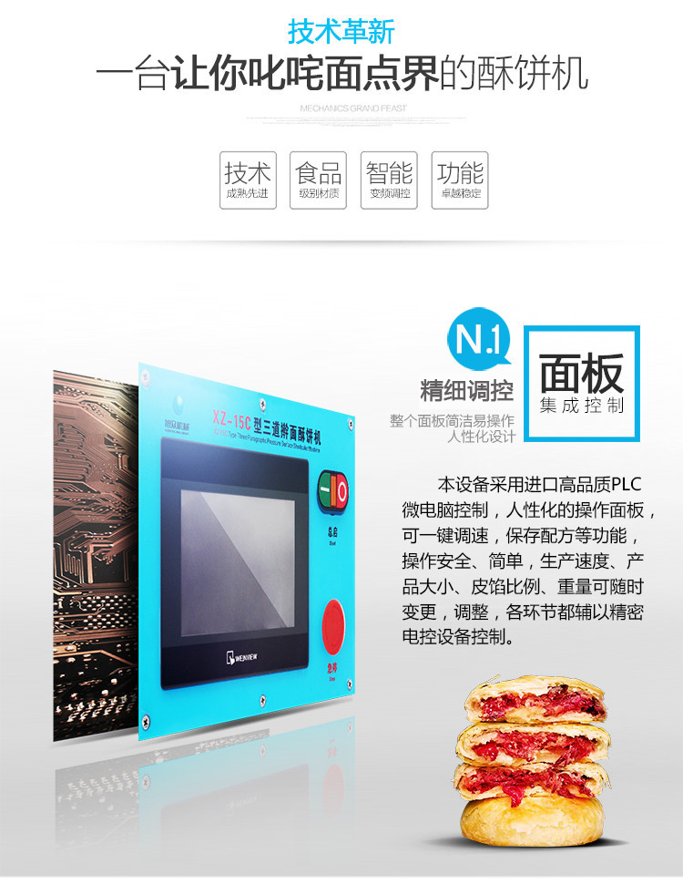 1、15C是我公司仿手工制作面食產品的機型,占地面積小,重量輕,它吸收國內傳統手工制作技術,即運用搟面杖搟面和碾壓面團的方式和保證面皮筋性且綜合考慮面食的口感而研發。