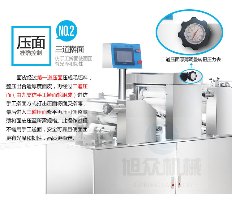 1、面皮經過第一道壓面,整壓出合適厚度面皮,再經過二道(由九支仿手工搟面輪組成)進仿手工搟面方式將面皮搟薄,進入三道可調整厚薄將面皮壓至所需規格。此操作過程不需用手工送面,安全可靠且使面團更有光澤和韌性,品質更穩定。