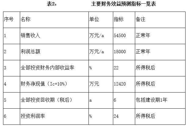 項目建成后,年銷售收入54500萬元,利潤18000萬元,投資回收期6年(稅后,含建設(shè)期1年),投資利潤率24%。
