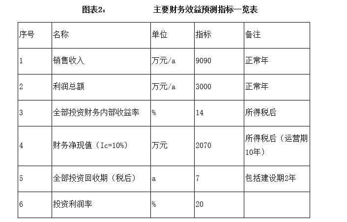 項目建成后,年銷售收入9090萬元,利潤3000元,投資回收期7年(稅后,含建設期2年),投資利潤率20%。