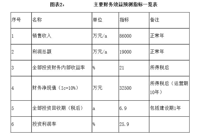 項目達產后年銷售收入86000萬元,利潤19000萬元,投資回收期6.9年(稅后,含建設期1年)投資利潤率25.9%。