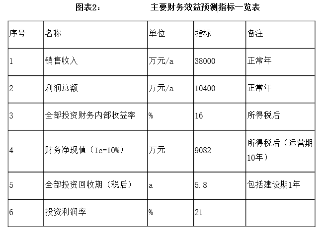 項目建成后,預計年營業(yè)收入38000萬元,利潤總額10400萬元,投資回收期5.8年(稅后,含建設期1年),投資利潤率21%。