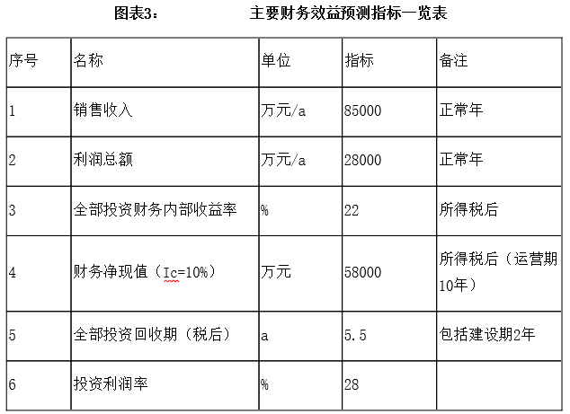 項目建成后,年銷售收入85000萬元,利潤28000萬元,投資回收期5.5年(稅后,含建設期2年),投資利潤率28%。