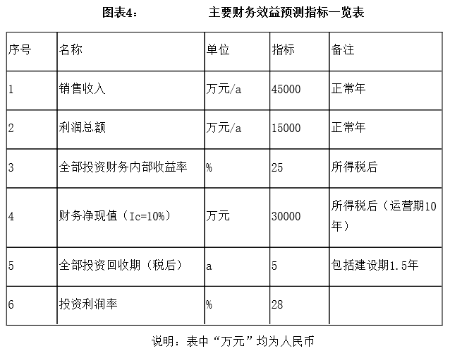 項(xiàng)目建成后,年銷售收入45000萬元,利潤15000萬元,投資回收期5年(稅后,含建設(shè)期1.5年),投資利潤率28%。