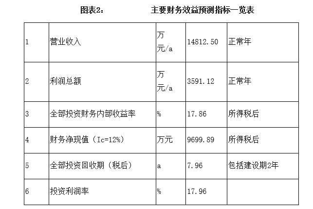 項目達產后,年銷售收入14812.50萬元,利潤3591.12萬元,投資回收期7.96年(稅后,含建設期2年),投資利潤率17.96%。