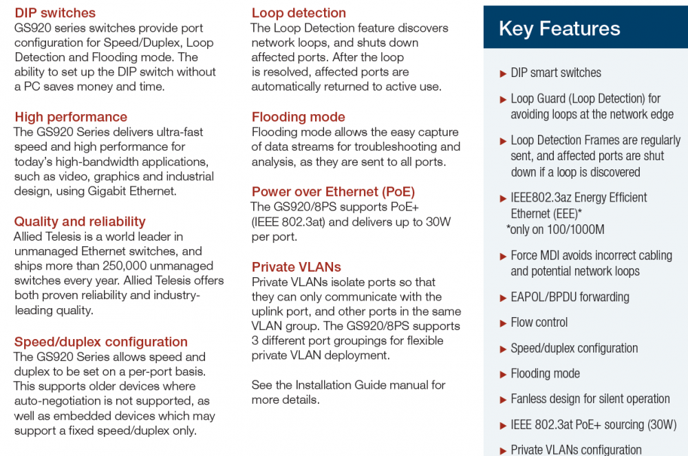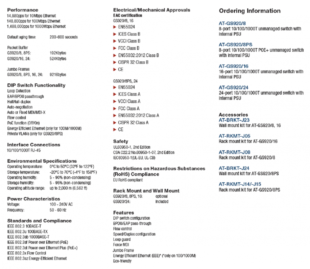 AT-GS920/8-50 Allied Telesis CentreCOM AT-GS920/8Switch unmanaged 8 x 10/100/1000 desktopAllied Telesis CentreCOM AT-GS920/8 Switch unmanaged 8 x 10/100/1000 desktop