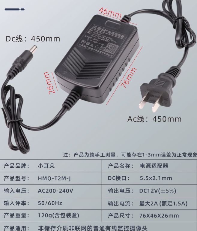 HMQ-T2M-J  DC12V  2A  5.5x2.1mm 小耳朵電源適配器、海康、大華監控攝像頭室內電源TEL:13910098771